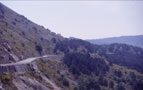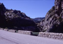 Ploetzlich veraendert sich die Strasse. Rechts geht es auf einmal steil hinunter und vor uns tauchen Felsen auf. Hier ist wieder alpines Gelaende. |