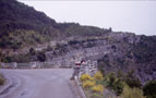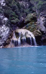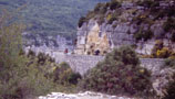Zurueck in La Palud geht es dann auf der Hauptstrasse wieder weiter bis zum Point Sublime. Hier gibt es nochmals einen besonders grossen Parkplatz, auf dem auch im Sommer viele Busse halten. Gegenueber liegt ein Restaurant, das wir empfehlen moechten. Man kann hier wunderschoen unter Weinreben sitzen und ein gutes Mittags-Menu geniessen oder einen Kaffee trinken. Von Point Sublime geht es noch ein kleines Stueck am Verdon entlang, dann kommt eine Abzweigung nach Comps und auf die Rive Gauche (linke Seite) der Schlucht. Als Zweiradfahrer oder mit dem PKW braucht man aber nicht bis Comps zu fahren sondern biegt bei dem mittelalterlichen Ort Trigance auf eine kleine "Abkuerzung", die recht steil hinauf und hinunter auf die Strasse fuehrt, die dann am linken Ufer entlang geht.