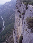 Als wir an der C.A.F. = Huette des Alpenvereins Frankreichs nach 10 km ankommen, steht hier ein "Durchfahrt-Verboten" - Einbahnstrassenschild. Wir muessen also nach La Palud zurueck bis zur richtigen, auch ausgeschilderten Abzweigung und den Kreis anders herum noch einmal fahren. Es ist also unbedingt zu empfehlen, den Schildern in La Palud zur Gorges du Verdon zu folgen. Aber der Weg lohnt sich in jedem Fall, denn auch auf dieser Seite sind viele, viele Parkplaetze, die Einsichten in den Canyon geben. Am Beginn der Schlucht bei der Barre de l'Escalès sind die glatten Felswaende bis zu 700 Meter tief (oder hoch, je nach Standort). Hier versuchen sich auch immer einige Bergsteiger im Freiklettern.