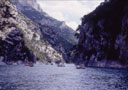 An einem anderen, sehr heissen Tag haben wir dann auch die Fahrt mit dem Tretboot in den Grand Canyon gemacht. Wir sind zunaechst ueber die obere Strasse am See entlang gefahren, um noch einmal nachzusehen, wie weit der Lavendel ist, leider immer noch gruen. Wir fahren dieses mal an Moustier vorbei zum "Badestrand" bei Les Salles und machen zunaechst ein ausgedehntes Picknick unter den schattigen Baeumen. Dann geht es uebers Wasser in den Canyon, man kann hier auch Kanus oder Kajaks mieten, je nach Lust und Laune, Kraft und Koennen. 2 Stunden sollte man sich mindestens Zeit nehmen. Nur so kann man die wilde Natur richtig wuerdigen. Man faehrt vom See unter der Strassenbruecke durch, in die spektakulaere Schlucht. Rechts und links steigen die senkrechten Felswaende mehrere hundert Meter ueber uns in den Himmel. Im unteren Teil sieht man, wie der Fluss die Felsen ausgewaschen hat. Weiter oben wird es etwas gruener, dafuer sind die Berge rechts und links noch hoeher und man erkennt ganz weit oben, winzig kleine Autos, die ueber die Schluchtstrasse fahren. Irgendwann wird die Stroemung des Verdon so stark, dass es nicht mehr weiter geht. Am Ende gibt es eine kleine Sandbank, dahinter schafft es niemand mehr weiter hinauf.