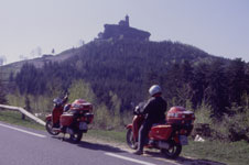 Von unserem Quartier in Obertronn fahren wir zunächst über die D28 durch den Kurort Niederbronn les Bains, Reichshoffen und Froeschwiller nach Woerth. Hier biegen wir nach links nach Lembach ab und erreichen beim Chateau de Fleckenstein die deutsche Grenze. Das alte Grenzhäuschen steht noch aber ansonsten merkt man den Übergang nur noch am Straßenbelag. Durch die winzigen Dörfer Hirschtal, Schönau, Gebüg und Petersbächel erreichen wir Ludwigwinkel. Dann geht es einige Kilometer über eine einsame Straße durch den Naturpark Pfälzerwald zum Teufelstisch. Hier erwischt uns der Autoverkehr wieder. Wir stoßen hier auf die B10 von Zweibrücken/Pirmasens nach Landau. Nach den ruhigen Stäßchen müssen wir uns erst an die "rasenden und überholenden Autos" gewöhnen. Wir biegen aber bei Hauenstein schnell wieder auf eine kleine Straße ab. Die wird immer enger und führt 1-spurig durch dunklen Wald auf den Weißenberg (607 m) mit dem Luitpoldturm und einem Restaurant. Noch ein Stück weiter und wir erreichen wieder die Zivilisation an der B48. Von nun an geht's nur noch bergab über Hochspeyer bis Enkenbach-Alsenborn. Hier legen wir heute unsere Mittagsrast ein. Dieses Stück ist wieder mal ein Stück Deutsche Alleenstraße. Sie führt die ganze Strecke nur durch den Wald.