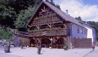 Von Munster geht es weiter nach Soultzbach les Bains dort biegen wir ab auf eine "weiße" Straße also eine ganz kleine. Wir fahren hinauf auf den Col du Firstplan (720 m). Die kleine Straße führt an der Mineralquelle von Soultzmann vorbei (Das Wasser bekommt man hier überall in der Gegend) weiter nach Lautenbach. Dort biegen wir gleich wieder rechts ab auf den Col de Boenlesgrab (865 m). Wir hatten gehofft von hier auf den Petit Ballon (1267 m) fahren zu können, aber am Boenlesgrab ist erst mal "Ende der Straße" hier ginge es nur noch zu Fuß weiter. Es ist aber Mittagszeit und es gibt hier eine gemütliche Ferme Auberge, in der wir es uns gut gehen lassen. Es steht u.a. auch Frischlingsbraten auf der Speisekarte, sowas muß natürlich gegessen werden.