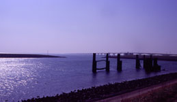 Zunächst fahren wir von Osstkapelle über einen kleinen Damm "De Banjaard" nach Noord-Beveland, um von dort über einen der lägsten Dämme, das Oosterscheldekering, die Oosterschelde zu überqueren. Zunächst ist hier ein Gezeiten-Kraftwerk, dann eine kleine Insel "Neeltje Jans" auf der es eine Ausstellung über die Fluten und den Bau der Dämme gibt. Daneben ist noch ein kleiner Vergnügungspark für Kinder. Leider ist dies alles erst ab 1. April zu besichtigen - sicher sehr interessant. Die Niederländer machen aber nicht nur aus Wasser Strom, sondern haben auch einige große Windparkt. Einer ist gleich auf der nächsten kleinen Insel, bevor es auf einer Brücke dann auf die nächste Insel Schouwen/Duiveland geht.