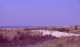 Nach dem Tunnel geht es zunächst noch auf einer vierspurigen Straße entlang, die sich dann aber bald verschmälert. Wir folgen der N 62 bis nach Middelburg. Hier grüßt uns die erste große Windmühle, jetzt wissen wir, dass wir in Holland sind. Von Middelburg fahren wir in Richtung Koudekerke und Zoutelande. Hier ist man eigentlich am Meer. Vor uns sehen wir aber nur "Berge". Die Dünen bzw. Dämme sind hier sehr hoch - zum Teil angeschüttet. Entlang dieses Damms verläuft die Straße nach Westkapelle. Dort steigt die Straße auf den Damm hinauf und man hat ein einen tollen Blick auf Strand und Meer. Nun müssen wir noch durch Domburg, ein netter Touristenort und weiter bis Oostkapelle. Hier werden wir die nächsten 3 Tage im Hotel Moerbei, mitten im Ort, verbringen.