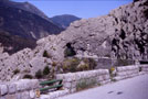 Ploetzlich veraendert sich die Strasse. Rechts geht es auf einmal steil hinunter und vor uns tauchen Felsen auf. Hier ist wieder alpines Gelaende. |