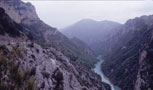 bis nach Castellane. In Castellane verlassen wir die Route Napoleon und folgen dem Flusslauf des Verdon zum "Grand Canyon du Verdon", dem groessten Flusscanyon Europas, dessen senkrechte Waende bis zu 700 m hoch sind. Beim Anblick einer solchen landschaftlichen Pracht nehmen wir uns vor, den Canyon noch mal in aller Ruhe ganz zu umrunden, und auch die ganze Schlucht abzufahren. Die Hauptstrasse kuerzt bei la Palud ein grosses Stueck des Canyons ab.