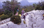 Als wir an der C.A.F. = Huette des Alpenvereins Frankreichs nach 10 km ankommen, steht hier ein "Durchfahrt-Verboten" - Einbahnstrassenschild. Wir muessen also nach La Palud zurueck bis zur richtigen, auch ausgeschilderten Abzweigung und den Kreis anders herum noch einmal fahren. Es ist also unbedingt zu empfehlen, den Schildern in La Palud zur Gorges du Verdon zu folgen. Aber der Weg lohnt sich in jedem Fall, denn auch auf dieser Seite sind viele, viele Parkplaetze, die Einsichten in den Canyon geben. Am Beginn der Schlucht bei der Barre de l'Escalès sind die glatten Felswaende bis zu 700 Meter tief (oder hoch, je nach Standort). Hier versuchen sich auch immer einige Bergsteiger im Freiklettern.