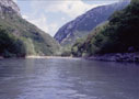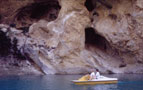 An einem anderen, sehr heissen Tag haben wir dann auch die Fahrt mit dem Tretboot in den Grand Canyon gemacht. Wir sind zunaechst ueber die obere Strasse am See entlang gefahren, um noch einmal nachzusehen, wie weit der Lavendel ist, leider immer noch gruen. Wir fahren dieses mal an Moustier vorbei zum "Badestrand" bei Les Salles und machen zunaechst ein ausgedehntes Picknick unter den schattigen Baeumen. Dann geht es uebers Wasser in den Canyon, man kann hier auch Kanus oder Kajaks mieten, je nach Lust und Laune, Kraft und Koennen. 2 Stunden sollte man sich mindestens Zeit nehmen. Nur so kann man die wilde Natur richtig wuerdigen. Man faehrt vom See unter der Strassenbruecke durch, in die spektakulaere Schlucht. Rechts und links steigen die senkrechten Felswaende mehrere hundert Meter ueber uns in den Himmel. Im unteren Teil sieht man, wie der Fluss die Felsen ausgewaschen hat. Weiter oben wird es etwas gruener, dafuer sind die Berge rechts und links noch hoeher und man erkennt ganz weit oben, winzig kleine Autos, die ueber die Schluchtstrasse fahren. Irgendwann wird die Stroemung des Verdon so stark, dass es nicht mehr weiter geht. Am Ende gibt es eine kleine Sandbank, dahinter schafft es niemand mehr weiter hinauf.
