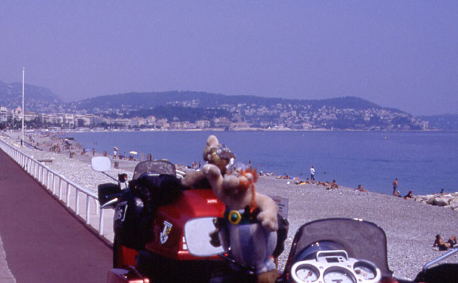 Von Gréolieres verlaeuft eine kleine Strasse durch die Gorges du Loup nach Grasse. Wir fahren aber geradeaus zum Col de Vence (963 m). Ab hier geht es nur noch bergab ueber Vence, St. Paul und Cagnes-sur-Mer ans Meer und ueber die Kuestenstrasse nach Nizza. In Nizza machen wir einen Stopp auf der "Promenade d'Anglais" zu Asterix und Obelix Zeiten "Promenade de Breton" (sh. "Tour de France"). Hier sind aber nicht nur Briten auf der Strandpromenade unterwegs sondern hauptsaechlich Franzosen.