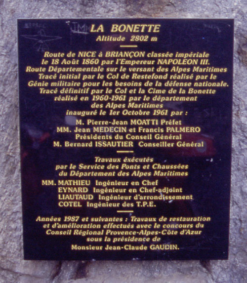 Danach wird die Strasse dann schmaeler und steiler, jetzt geht's wirklich ins Hochgebirge. Sie steigt innerhalb von 26 km hoch ueber 1347 m am Pont Haut ueber 2.261 m am Col des Fourches und 2680 am Col des Raspaillon auf endgueltig 2802 m am Col de la Bonette. um den Gipfel, den Cime de la Bonette kann man im Einbahnstrassensystem herumfahren, bis zum Gedenkstein fuer die Strassenbauer am Bonette.