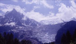Die Strasse fuehrt von Beaufort in die Olympia-Stadt Albertville. Wir biegen rechts hoch auf den Col des Saisies. Hier oben in les Saisies (1.650 m) fanden damals die olympischen Langlaufwettbewerbe statt. Auf die andere Seite hinunter geht es nach N. D. de Bellcombe (1.010 m). Hier verlassen wir nun endgueltig unsere grandiose Route des Grandes Alpes, die ueber La Clusac, Bonneville und noch diverse Cols nach Thonon-les-Bains an den Genfer See fuehrt. Wir wollen aber ueber Mégeve und St. Gervais nach Chamonix. Eigentlich hatten wir vorgehabt, mit der Seilbahn auf die Aiguille du Midi zu fahren um uns den Montblanc aus Naehe anzusehen. Hinter St. Gervais haben wir den grossen Berg und seine Gletscher, die fast bis ins Tal hinuntergehen immer im Blick. Ausserdem ist der Gipfel dauernd von Wolken umgeben, die kaum einen Blick darauf freigeben. Also schenken wir uns und Fahrt mit der Seilbahn und machen in Chamonix nur ein paar Fotos.